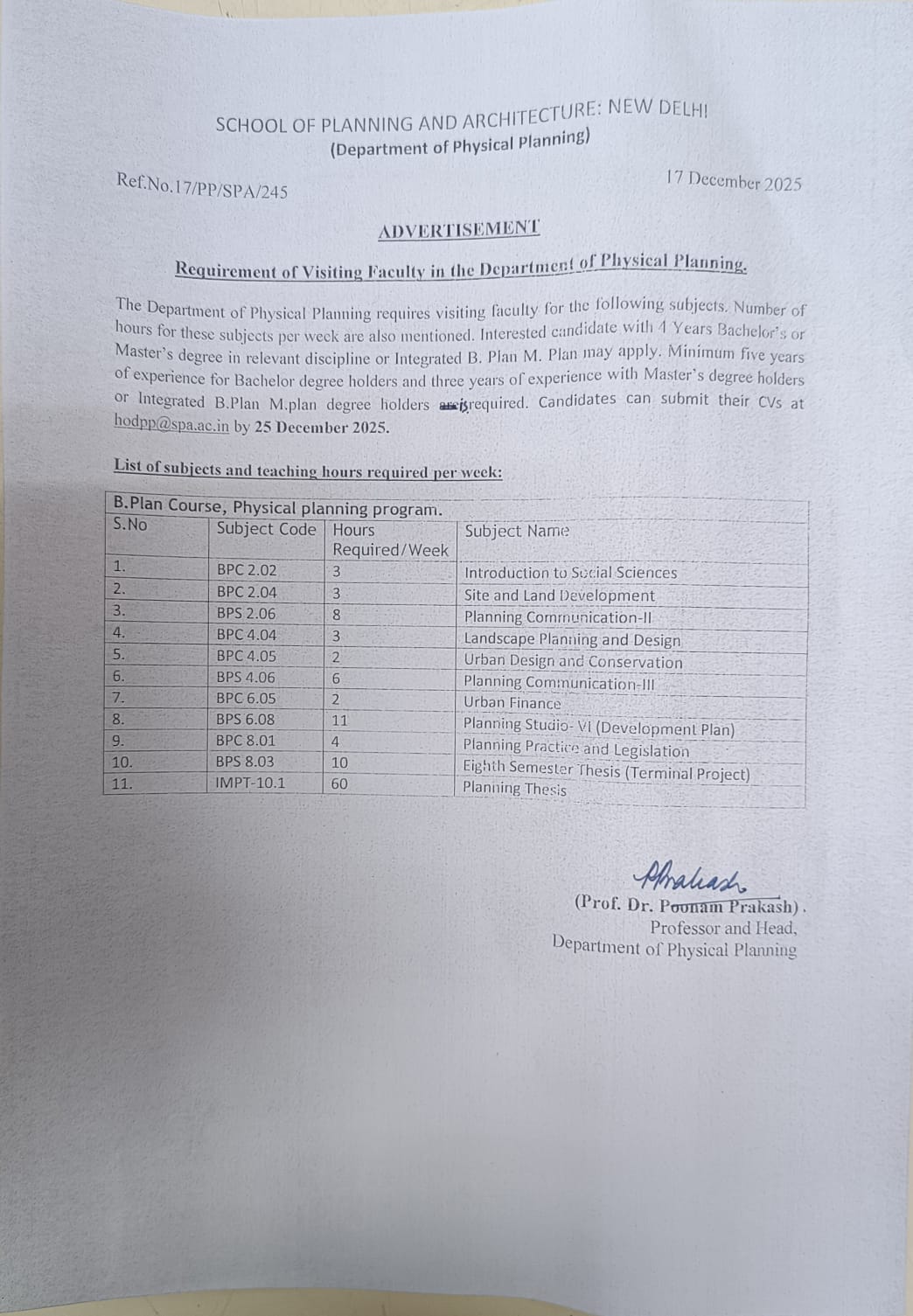 The School of Planning and Architecture, New Delhi (SPA New Delhi) is a Institution of National Importance imparting education in planning, architecture, and design. SPA New Delhi provides training at various levels, in different aspects of human habitat and environment. The School offers highly sought after academic programmes in specialised fields at a Bachelor's, Master's and Doctoral level. The School, in striving for excellence has always been in the lead in extending education and research to new frontiers of knowledge. Human habitat and environment being the basic concern of the School, the spectrum of academic programmes is being continuously extended by providing programmes in new fields and emerging areas.